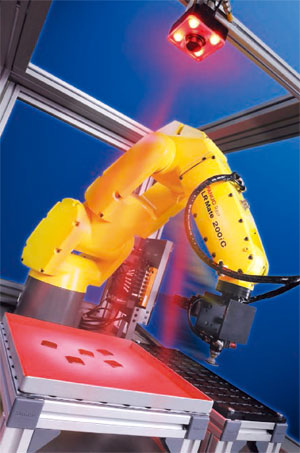 集成检测 给机器人添加一只“眼睛”,对于食品行业来说是可行的。食品行业需要对产品进行检测,定位和定向,以减少浪费,提高生产效率。发那科公司最新的iRVision模拟人的肉眼,作为发那科公司R-30iB控制器的组成部分,它能精确地拾捡起传送带上的任意产品,它非常适合于那些要求高分辨率或彩色摄像机的食品和包装应用。“将视觉技术集成到控制包内,这样食品公司就具备了视觉跟踪的能力,切无需设置外部PC,”发那科英国公司技术经理Darren Whittall说。由于iRVision是发那科公司R-30iB控制器的一部分,所以无需第三方软件来运行或是给这个视觉系统编程。Darren说:“iRVision可以提供真正的即插即用解决方案,无需在摄像机和机器人之间执行你自己的通讯协议,这让它成为了一款高效率的系统,使用起来快速而且简便。”