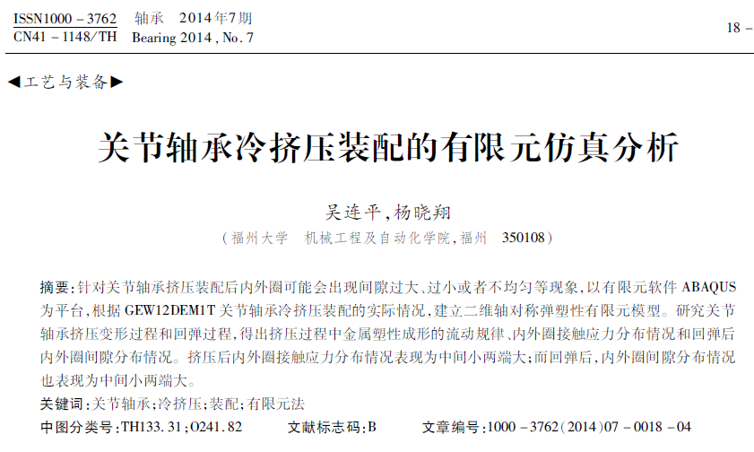 针对关节轴承挤压装配后内外圈可能会出现间隙过大、过小或者不均匀等现象,以有限元软ABAQUS为平台,根据GEW12DEM1T 关节轴承冷挤压装配的实际情况,建立二维轴对称弹塑性有限元模型。研究关节轴承挤压变形过程和回弹过程,得出挤压过程中金属塑性成形的流动规律、内外圈接触应力分布情况和回弹后内外圈间隙分布情况。挤压后内外圈接触应力分布情况表现为中间小两端大;而回弹后,内外圈间隙分布情况也表现为中间小两端大。