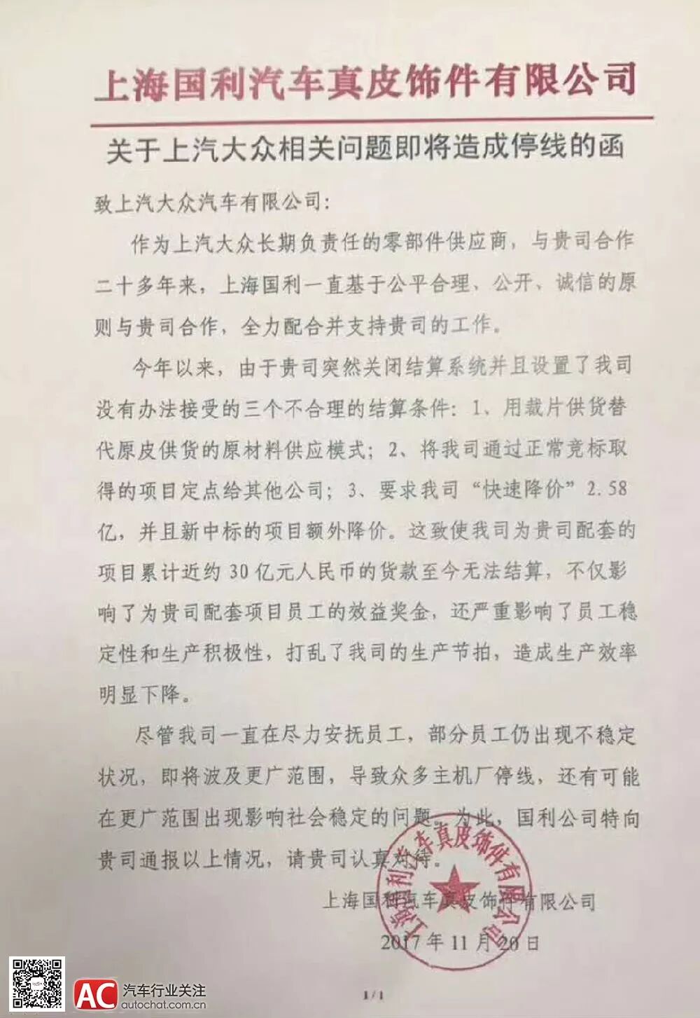 汽车行业关注(autochat.com.cn)11月29日报道—— 日前,我们收到一份供应商(上海国利汽车真皮饰件有限公司)致上汽大众汽车有限公司的函件,为《关于上汽大众相关问题即将造成停线的函》。里面提到因上汽大众向其提出三个不合理条件,致该供应商30亿元人民币的货款至今无法结算。导致公司及员工出现不稳定的状况影响生产效率,有可能出现众多主机厂被迫停线,甚至是影响社会稳定问题。
