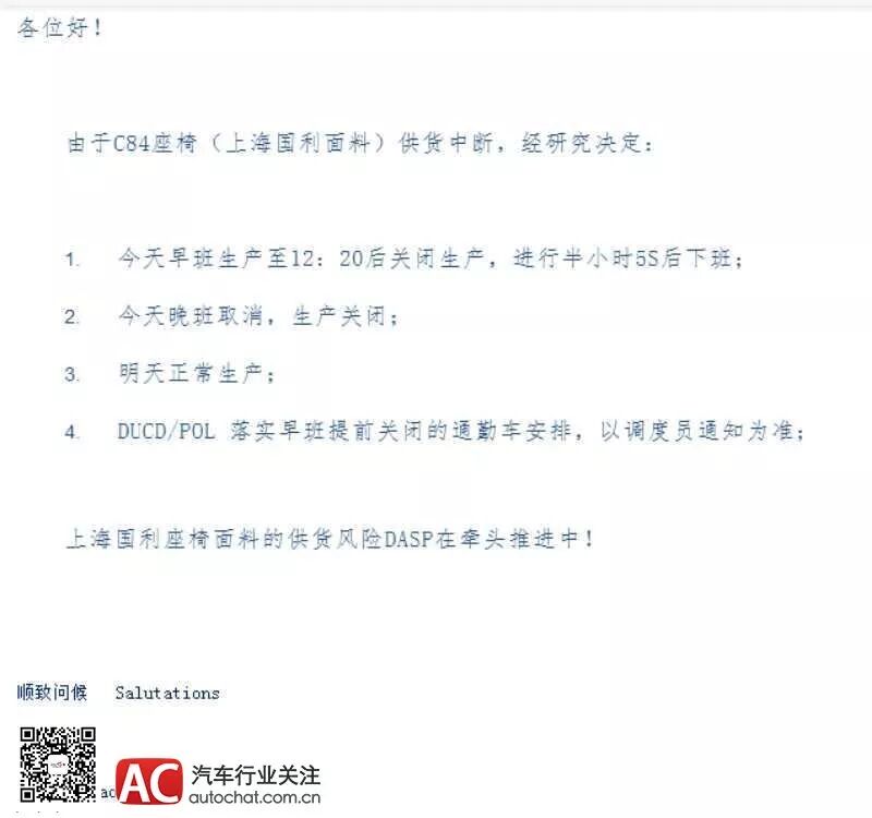 有业内人士向我们提供了一份来自神龙汽车公司成都工厂(四厂)的内部信件,里面提到“一款代号为C84的车型已经因为座椅问题而短暂停产”。据我们所知,C84对应为东风雪铁龙品牌,应该为新上市的天逸 C5 AIRCROSS车型。但并未表明是否因上海国利与上汽大众之间的矛盾所致。